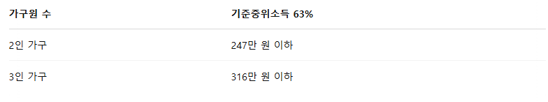 ※ 참고 : 2025년 기준 중위소득 63% 이하 가구, 18세 미만 자녀를 둔 가정이 주대상