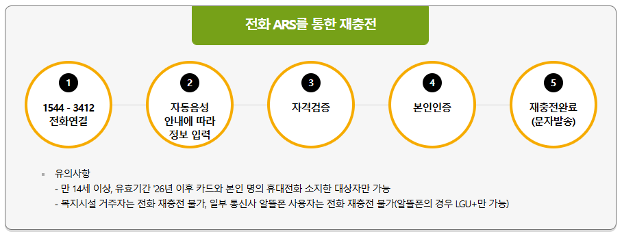 충전 한도: 카드 1매당 1회 100원 이상, 충전 시점 보유 잔액 포함 최대 30만 원까지 가능, 연간 누적 이용 금액 200만 원 한도