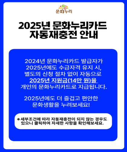 자동 재충전 대상자: 2024년 문화누리카드 발급자 중 사용 이력이 있고 수급 자격을 유지하는 경우 별도의 신청 없이 자동으로 2025년 지원금이 기존 카드에 충전됨