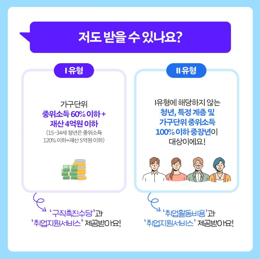 -저소득 구직자: 가구 소득이 중위소득 60% 이하인 구직자들이 해당됩니다. 이는 경제적으로 어려움을 겪는 사람들이 보다 안정적으로 취업할 수 있도록 지원하는 목적을 가지고 있습니다.