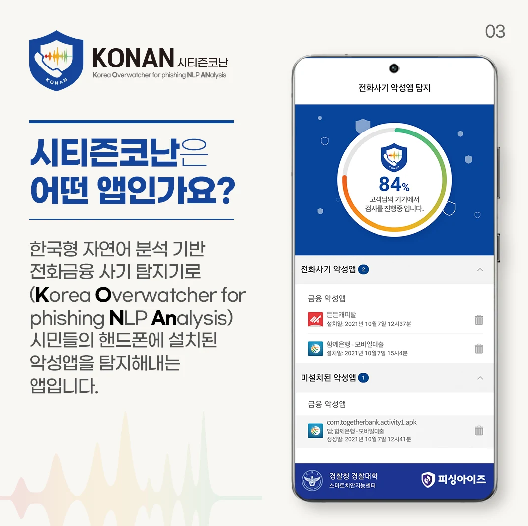 스피싱 범죄가 점점 정교해지는 가운데, 경찰청이 개발한 시티즌코난 앱은 악성 앱과 원격 제어 앱을 탐지하여 금융 사기를 예방하는 역할을 한다.