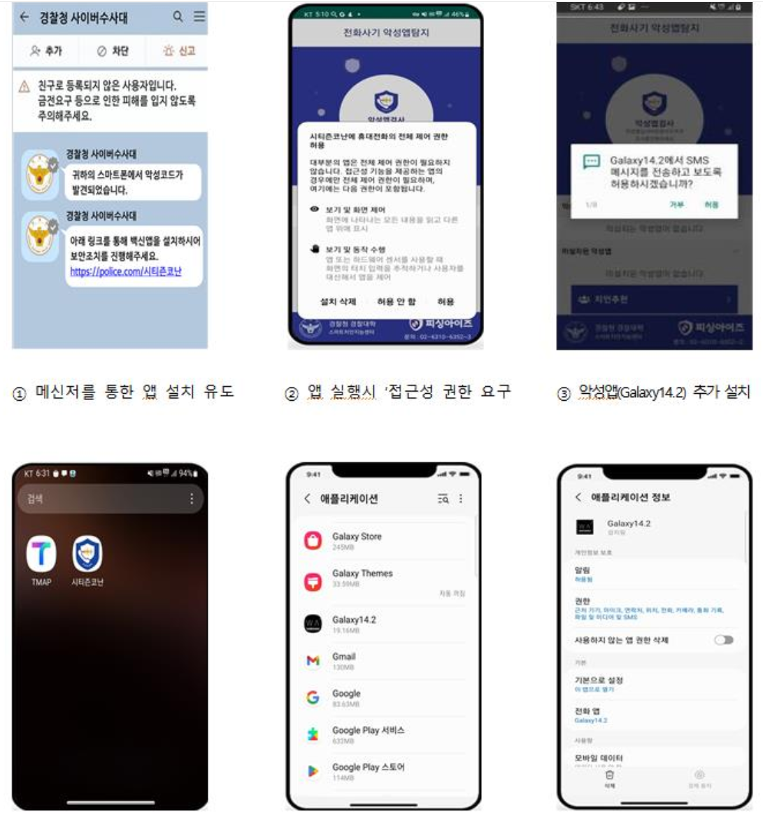이러한 가짜 앱은 피해자의 스마트폰에서 계좌 정보, 인증번호, 연락처 목록 등을 빼내거나 원격 조작을 통해 추가적인 피해를 유발할 수 있다. 따라서 경찰청은 금융기관 또는 수사기관에서 특정 앱 설치를 요구하는 경우 반드시 의심해볼 것을 강조하고 있으며, 공식 앱 마켓이 아닌 경로에서 앱을 다운로드하지 않도록 주의를 당부하고 있다.