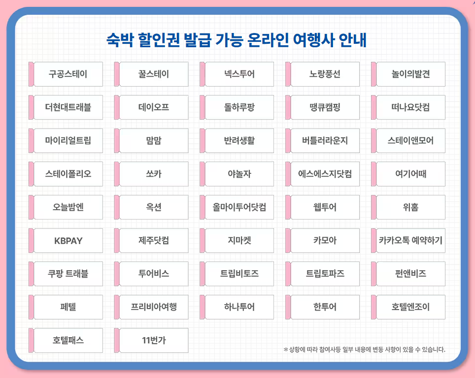 숙박 할인권은 다양한 온라인 여행사에서 신청 및 사용할 수 있습니다. 주요 참여 사는 다음과 같습니다.